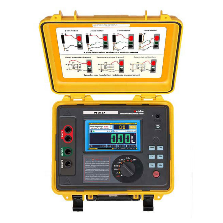 VS-3127Megohm Meter Testwis dirancang kanggo aplikasi tes Listrik lan Industri, ing ngendi voltase operasi ngluwihi 1000 V lan voltase tes insulasi sing luwih dhuwur dibutuhake.